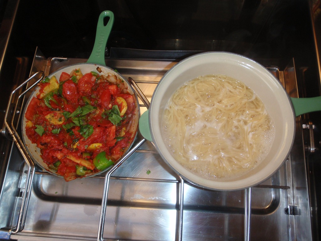 Sautee fresh vegetables (carrots, peppers, squash, tomatoes, zucchini). When tender, add fresh basil and create sauce with 1 can of tomato paste and olive oil to thin. Serve over spaghetti.