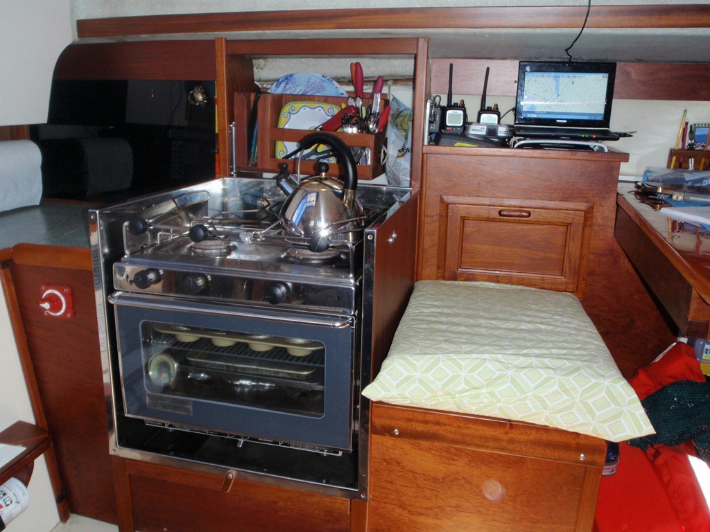Next to the galley is the navigation panel.  Grant spent a lot of time thinking about this area and designing it.  It was very important for him to have a chart table and navigation area where we could look at our course and take down plots. (A plot is a mark on the chart with our position.)