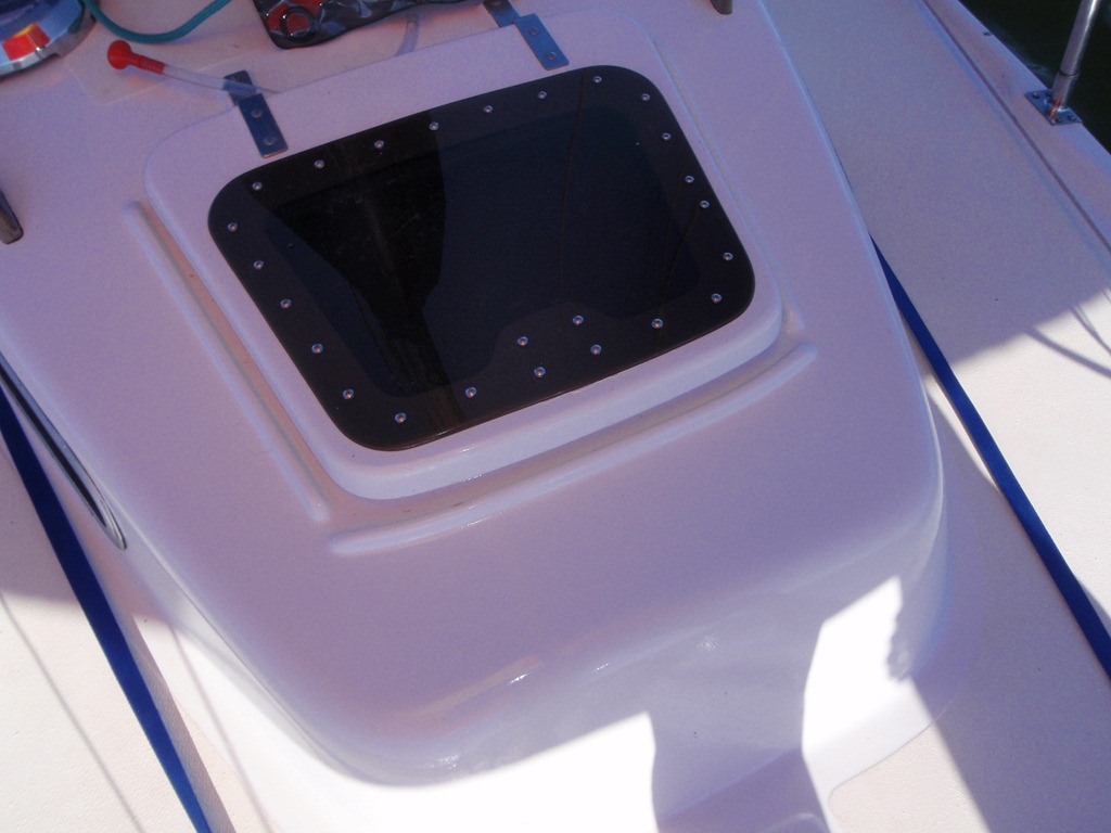 He touched up the hatch and edges with a few coats of the white Perfection paint we had used on the topsides.  Using a heavy sealer he bolted the lexan to the hatch and we let is dry for a couple of days and then installed it onto the boat.