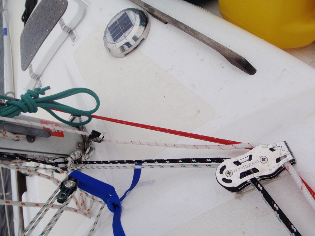The shock cord is clipped off to our dodger.  It is very secure, but I can punch it out.  This is good because if a big wave came it wouldn’t strain the dodger, just pop out.