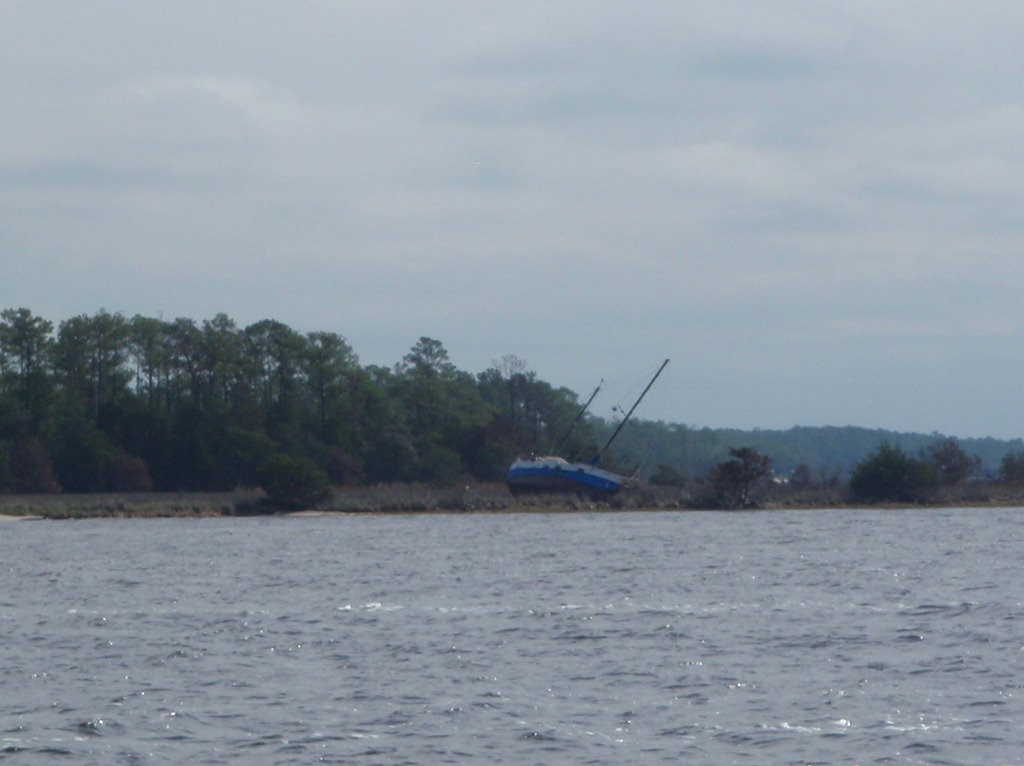 We have two problems anchoring our boat.  1. The major issue is that we cannot wrap our heads around the concept that we are 27 feet long.  After sailing tallships, our perception that we are at least 60 feet long makes finding a spot to anchor take much thought and consideration (how will we swing?, is there enough room?).  Then, as we set our anchor we naturally fall back closer to those around us.  In Beaufort we wanted to make sure the boat behind us was okay with where we were in front of them, so we hopped in the dinghy and went over to say hi and ask.  As we approached the 40 foot sailboat we looked back at our own– a speck in front of them, not close at all.  It is hard for us to fully grasp how small we are, but we are working on it.  2. We also struggle with depth denial, in 12 feet of water I start to get nervous, in 6 feet I am traveling at a snails pace into the anchorage.  (we draw 3.8 feet and the one time I felt us brush the bottom in the Chesapeake the sounder was reading 3.5)  I think this is a good thing though, because being overly cautious means we will have less chance of running aground, right?