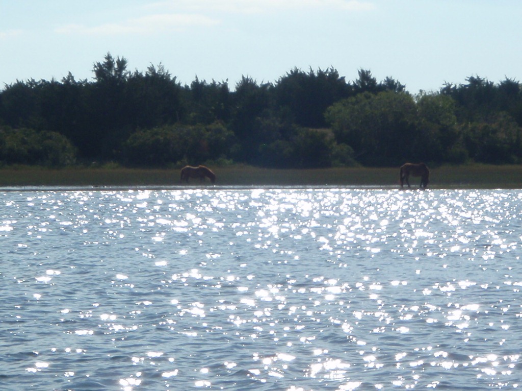 We have found every 10-year-old girl’s fantasy island in Beaufort, NC.  It is inhabited by wild ponies and surrounded by dolphins.  We are anchored in between this island called Bird Shoal and the town of Beaufort, NC.