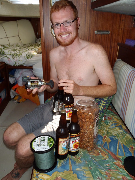 She returned to the boat bearing gifts for Grant. His birthday is coming up, so he was spoiled with a new camera, new fishing reel, his favorite peanut butter pretzels and his favorite beer – Racer 5, as well as some local brews from Seattle.![]()