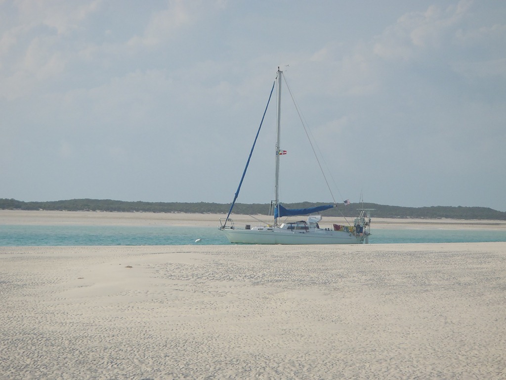We had trouble finding a spot among the sandbars and scoured channels.   We didn’t get a good hold on our anchor (something we don’t experience a lot) and found limited space.  We nestled up to a sandy spot with good holding, putting out two anchors so that we didn’t swing into a shallow bump at low tide.  Grant swam all around the boat to see what the bottom was like.  A low tide he was standing next to Velocir!!