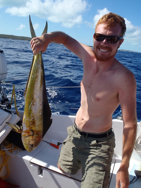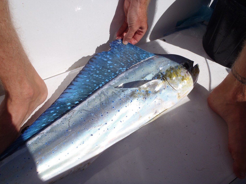 As soon as Mahi Mahi are caught, they turn from a brillant Green-Blue coloring to yellow, to green and finally grey. It is very sad and beautiful!