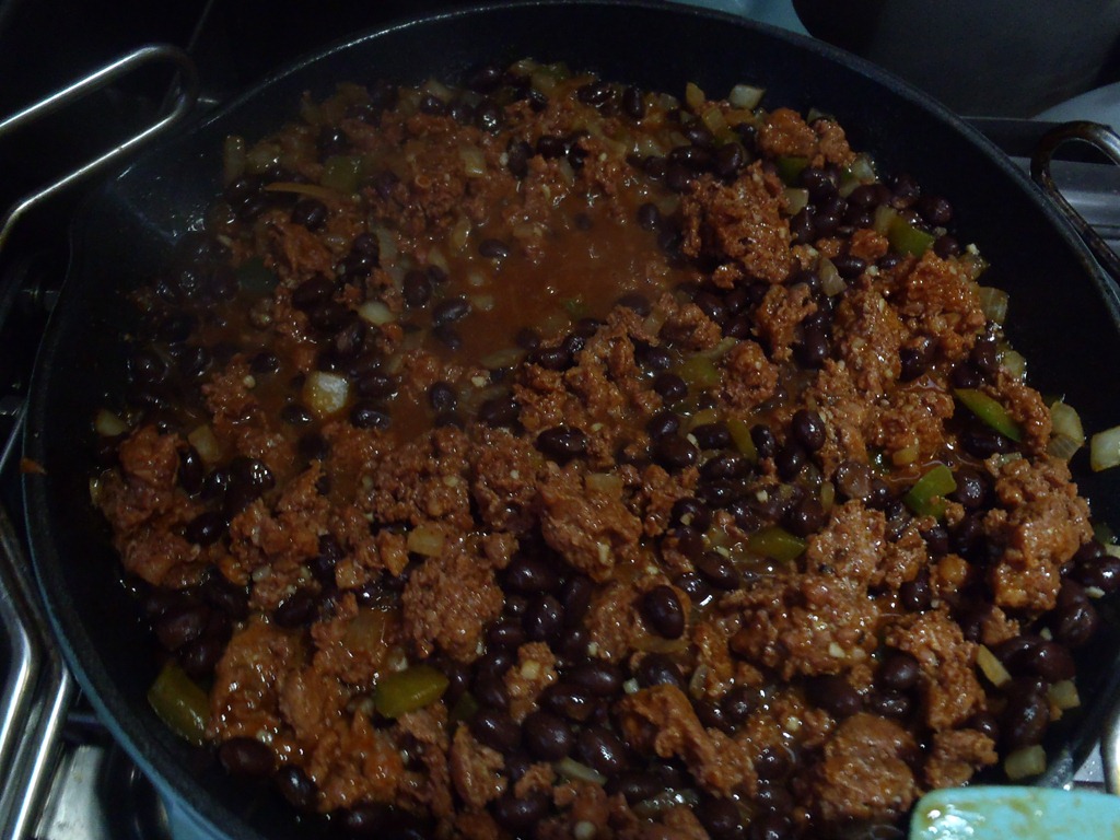 The chorizo, can of black beans, onions and green pepper was heated up in the same pan after the tortillas were made. (The tortillas took a long time, rolling them out and heating them.)