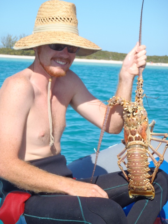 Then, just as we were about to leave, Mark from Sandpiper came back with a fish and said he had spotted another lobster. Grant went over to the spot and speared a medium-sized lobster. Amelia spotted a mega-lobster and Mark speared it. It is the biggest lobster we have seen!