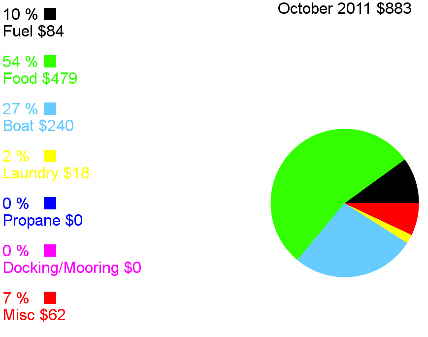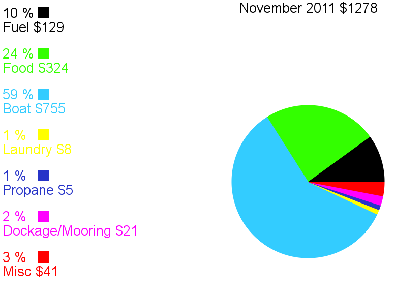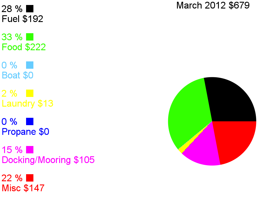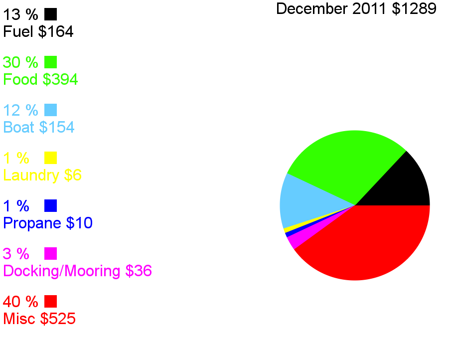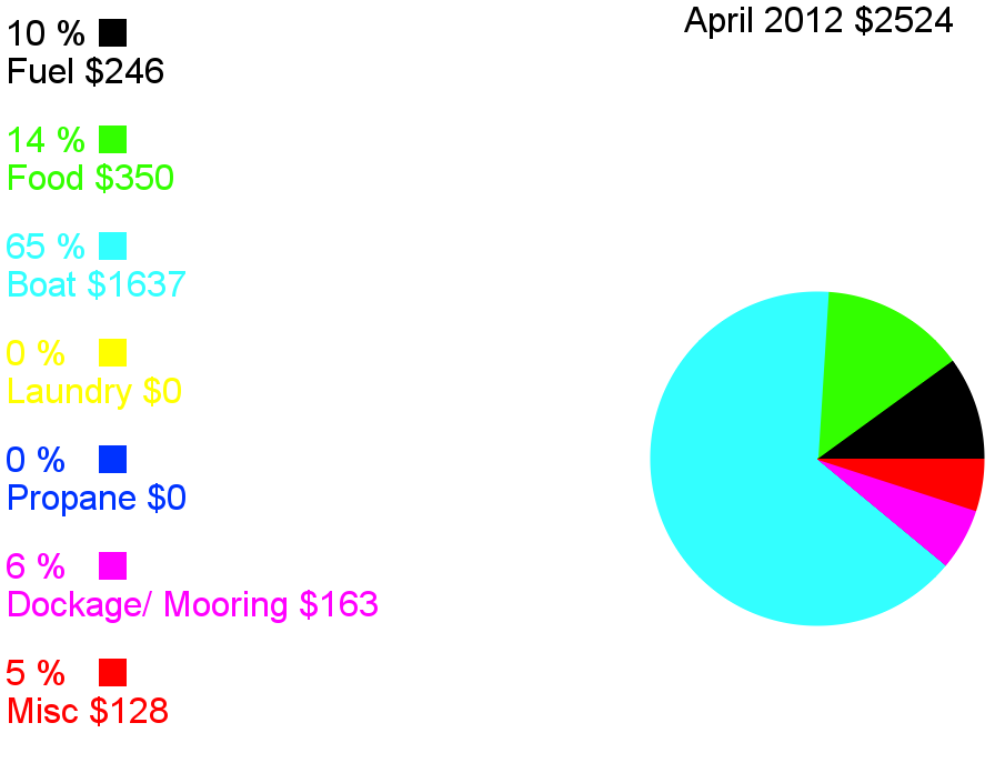 Our cruising costs are 100% accurate. Every receipt was recorded into a spreadsheet and reviewed monthly. Our goal was to spend no more than $1000 a month. As you can see, the average cost per month was $920, and could have been less if not for our towing incident! The total we spent during 8 months was $7421. It turns out, once the boat is cruising-ready, it is the cheapest thing we can do. (Not many lifestyles where you do not pay to sleep at night.)
