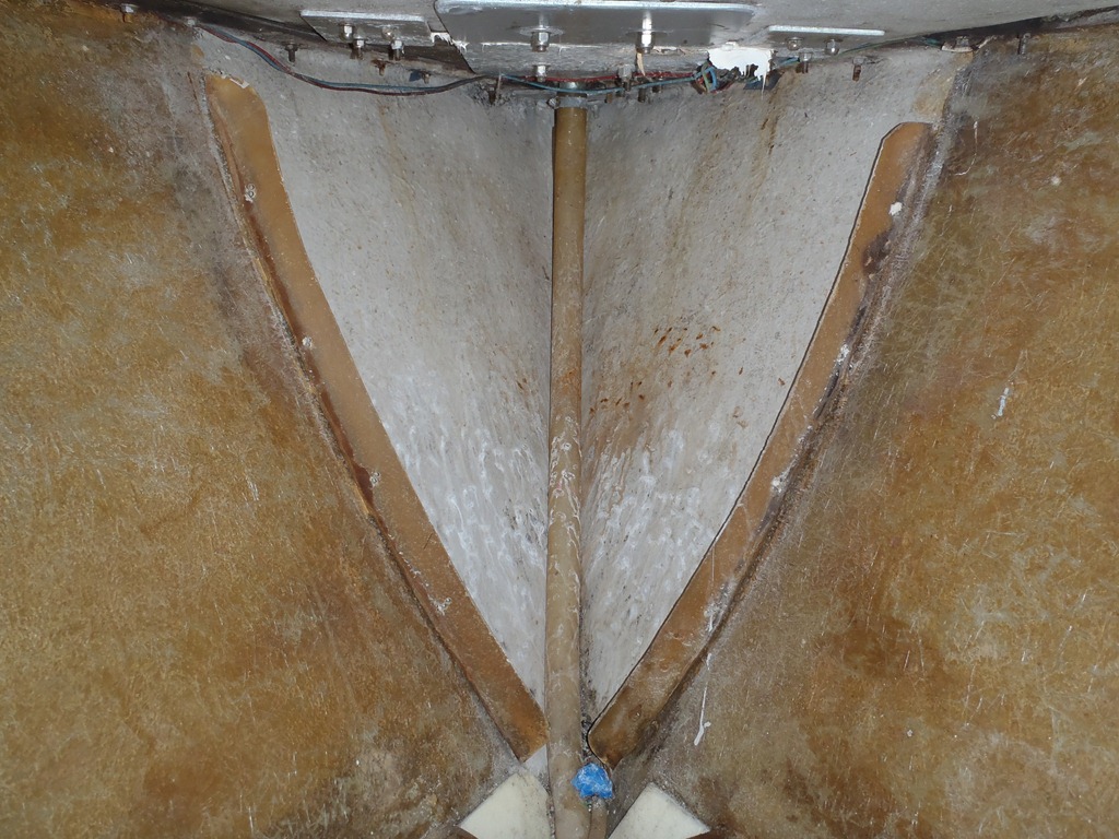 There are two reasons why the interior desperately needs to be painted—mold and flaking paint. Why is this happening—this is caused mostly by A) porous old paint on a bumpy fiberglass surface B) a gel-coat like filler was used along the outer 1-2 inches of the hull right where the deck meets the hull. This filler has flex cracks, or in some cases just crumbly texture, causing a mold habitat. As the cracks held moisture the paint started to flake and fall off. The paint is not adhering to the filler at all anymore.