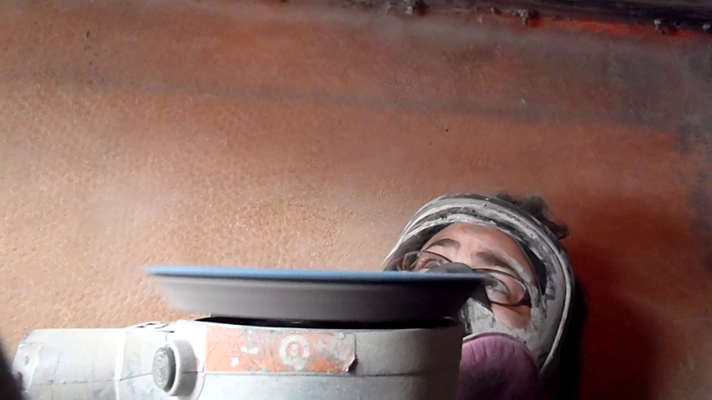 About halfway into the project Amelia started to regret the undertaking. Dust everywhere, sanding in corners, upside down, around windows and other obstacles. Her arms started to feel weak from pushing the sander against the hull. What a mess the boat was! But it was too late to turn back now.