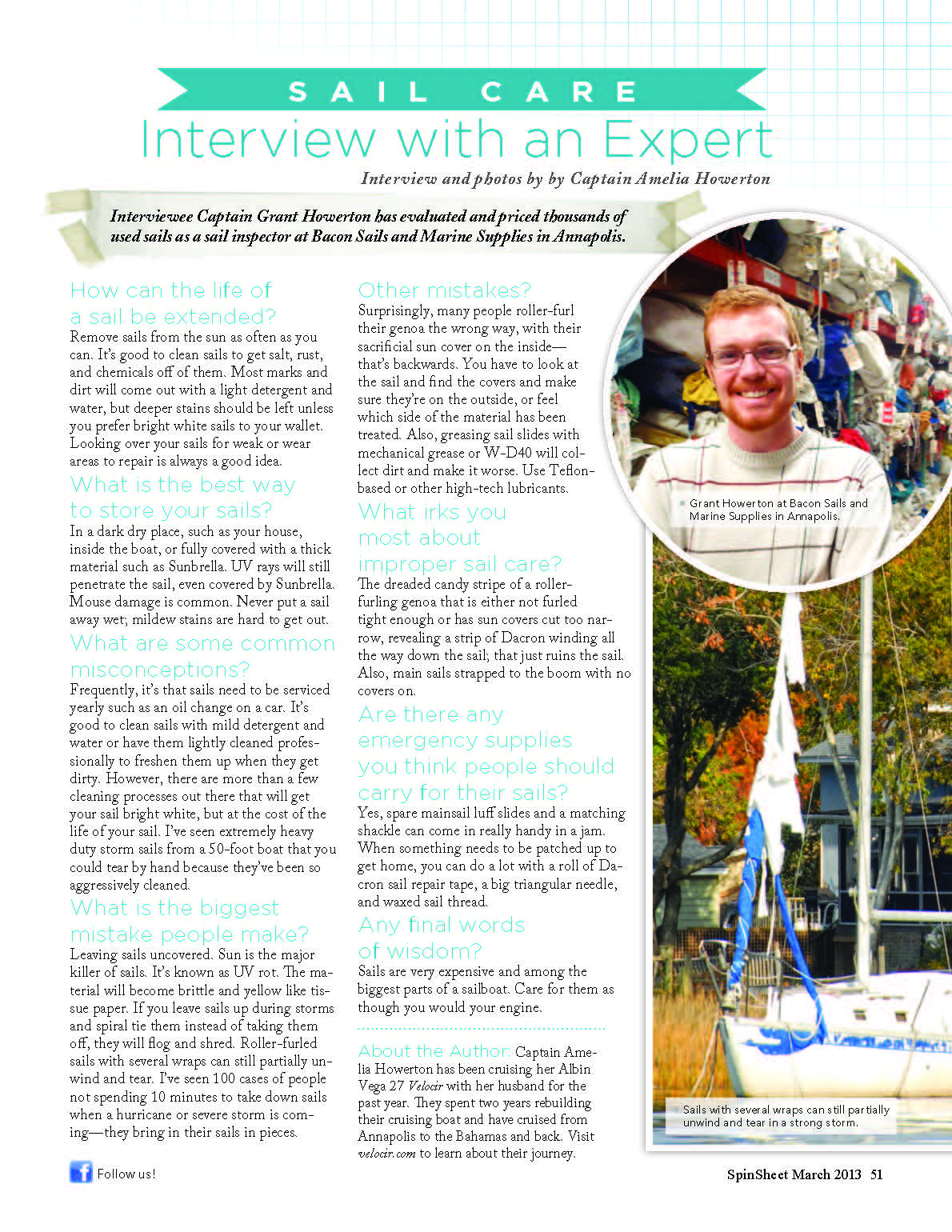We are excited to share that Grant has been featured in SpinSheet’s March 2013 issue, sharing his knowledge of sails and how to care for them. Having inspected thousands of sails as an inspector for Bacon Sails and Marine Supplies in Annapolis, MD, he has always wanted to give a few pointers, hoping it would help others to extend the life of their sails.