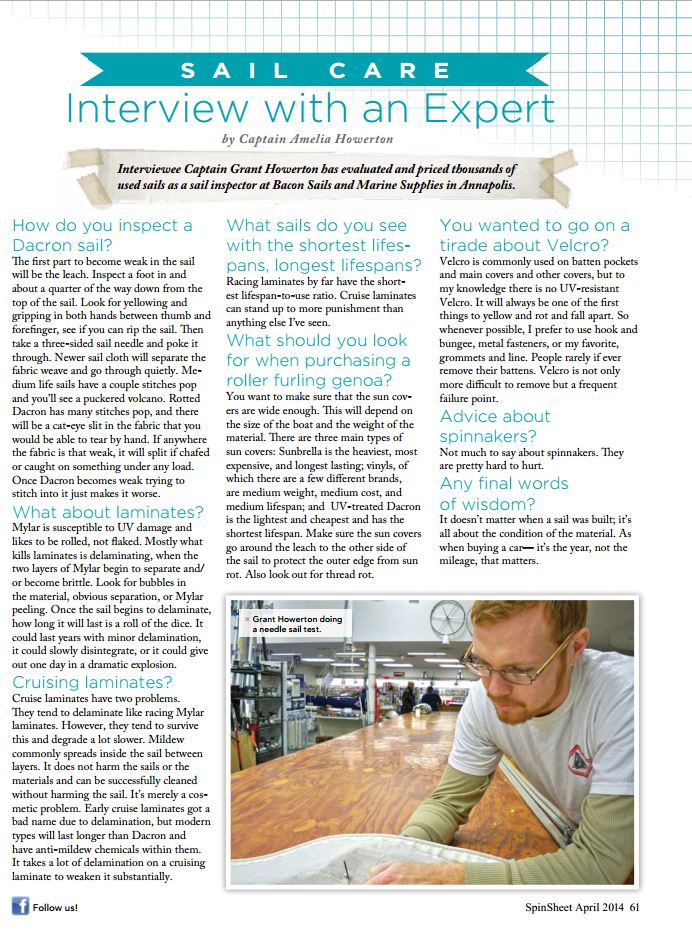Amelia’s article, Sail Care, Interview with an Expert, appears in the April issue of SpinSheet magazine. Grant worked as a sail inspector for two years at Bacon Sails and Marine Supplies in Annapolis, MD. Here are some of his tips on Sail Care!!